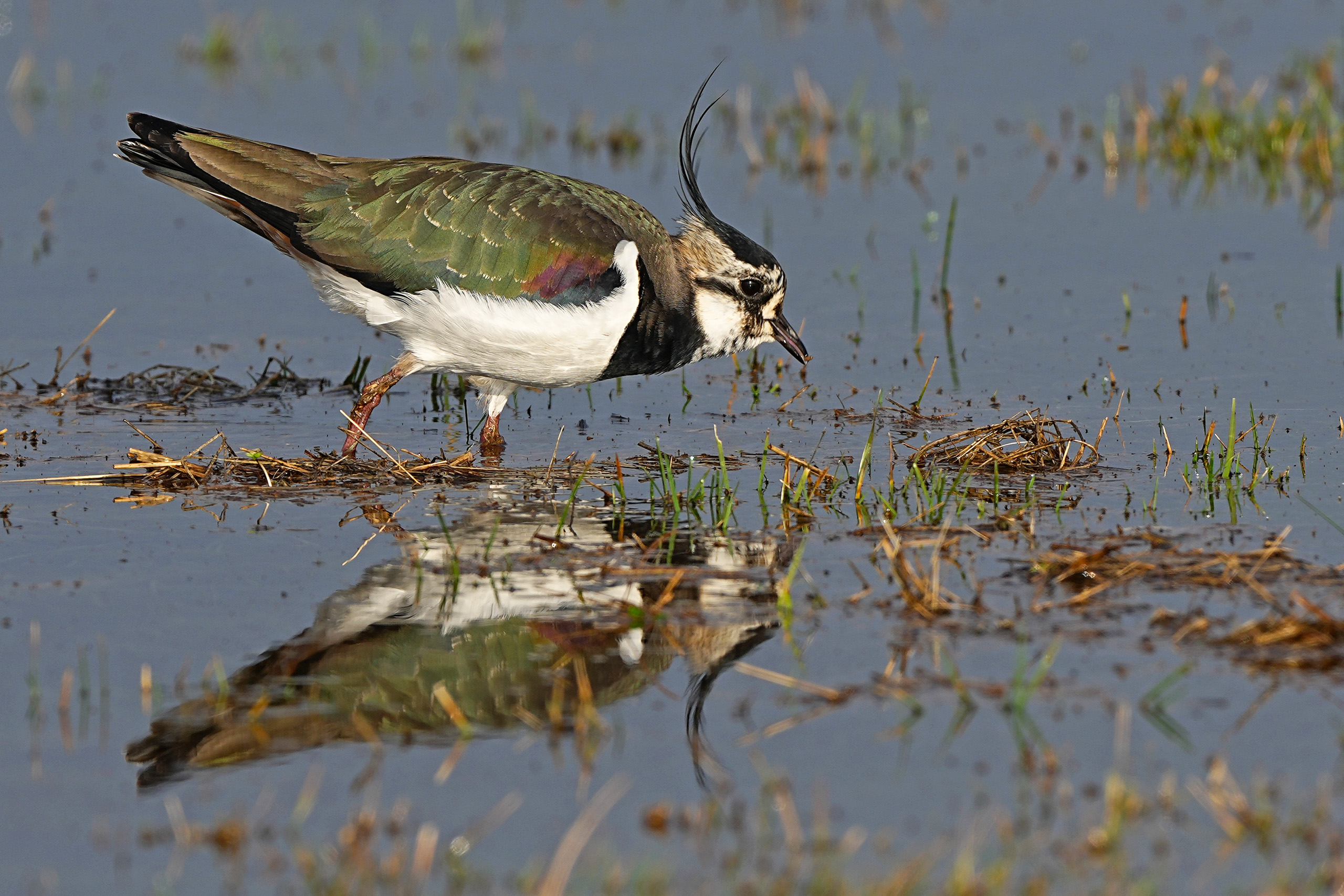Ein Kiebitz auf einer der vielen überschwemmten Wiesenflächen, bei der Nahrungssuche.