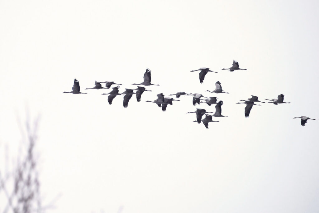 Schnell reingeflitzt und die kleine Kamera geschnappt. Tatsächlich kam ein Trupp von 60+ Kranichen ziemlich nah und tief vorbeigezogen.