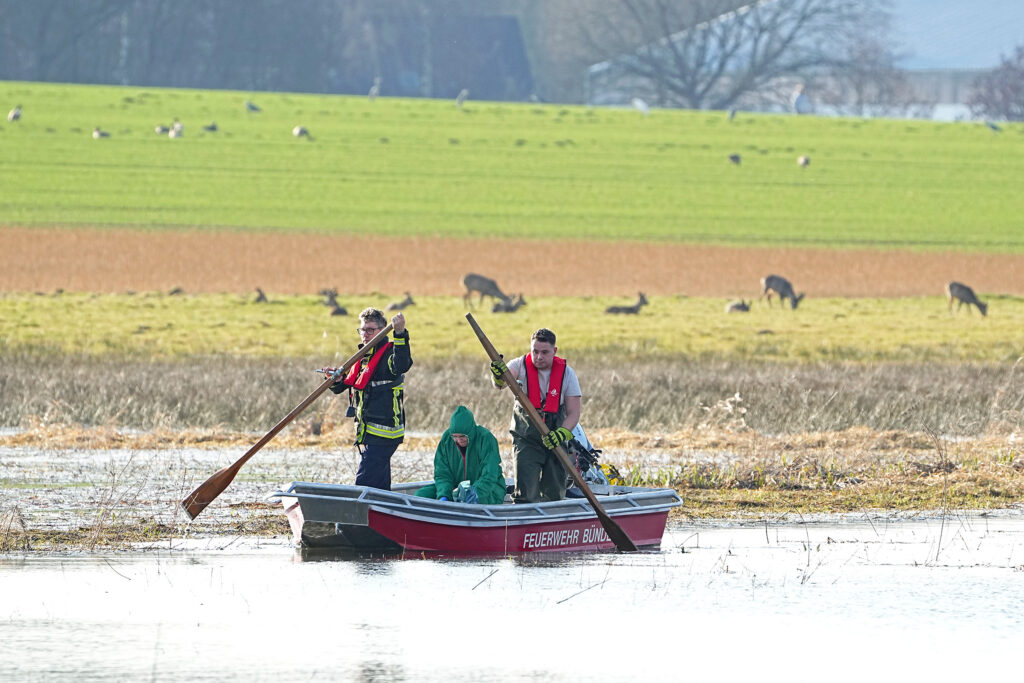 Also kontaktierte die Dame vom Amt die Feuerwehr in Enger. Als der Feuerwehrmann eintraf, stellte sich heraus, das Enger wohl kein geeignetes Boot hat. Somit kam die Feuerwehr Bünde ins Spiel und rückte mit einer ordentlichen Mannschaft und einem Boot an.