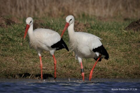 Das Storchenpaar weilt bereits seit einigen Tagen wieder im Bünder Elsebruch, doch erst heute Nachmittag konnte ich dort meine Aufwartung machen. Das besonderes Augenmerk galt dabei natürlich dem Männchen.Der Storch mit der Ringnummer 9X216 ist bereits zum 14. Mal zu einer Brutsaison in den Elsebruch eingeflogen. Im Jahr 2013 brütete er hier erstmals mit seiner damaligen Partnerin. Bekanntlich handelte es sich dabei um das erste Storchenpaar das sich im Kreis Herford niedergelassen hatte .Im vergangenen Jahr zählten wir im Kreis Herford 12 aktive Brutpaare, davon allein vier in Bünde. Mit wechselnden Partnerinnen hat das Bünder Storchenmännchen in den zurückliegenden Jahren insgesamt 26 Jungstörche großgezogen. Dieses Jahr scheint er zeitgleich mit einem Weibchen eingezogen zu sein. Ob es die selbe Störchin wie aus dem Vorjahr ist, kann ich bist jetzt noch nicht beurteilen.