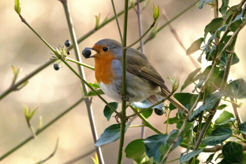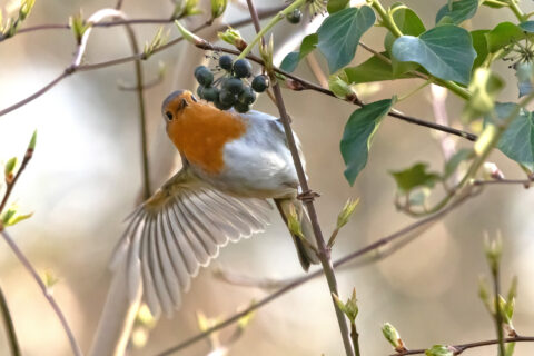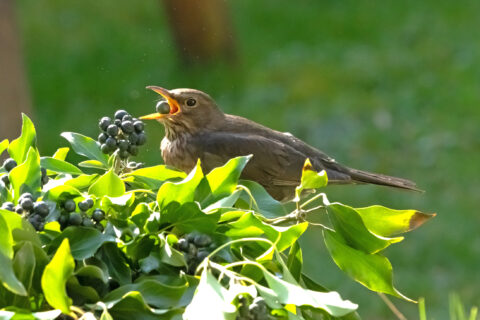 Derzeit sind viele Staren- und Rotdrosselschwärme in den Wäldern unterwegs, die efeuberankte Bäume anfliegen, um dort die Beerenfrüchte zu konsumieren. Bei mir im Garten sind auch Amseln, 1 Singdrossel und 1 Rotkehlchen an den Früchten interessiert.