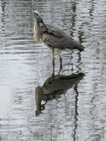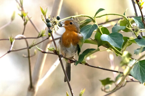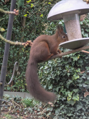 An unserer Futterstation hat das Eichhörnchen immer den größten Appetit. Die schwarzen Früchte vom Efeu sehen wirklich verlockend aus, leider konnte ich dort noch keine geflügelten Gäste beobachten. Der Graureiher am Meierteich war heute kein wenig scheu.