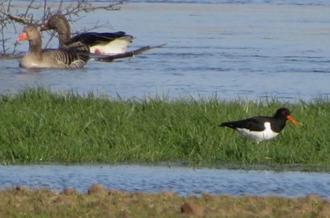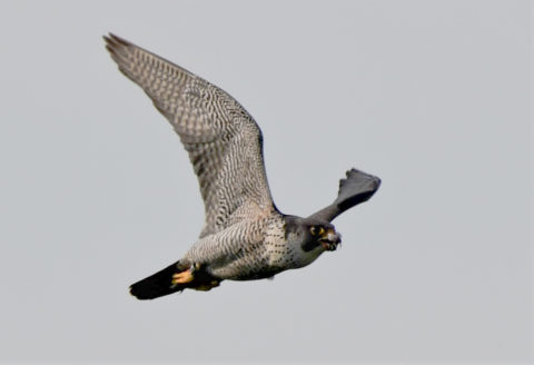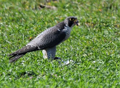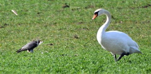 Den Wanderfalken, der seit einiger Zeit im Bereich des Nistkastens am Schornstein der Ziegelei am Steinhorster Becken gesehen wurde, konnte ich heute auf dem Grünland gegenüber dem Stauwehr beim Verzehren einer Beute (Taube?) beobachten. Gleich daneben grasten seelenruhig zwei Höckerschwäne.