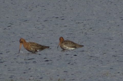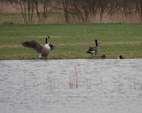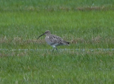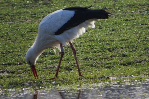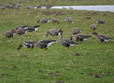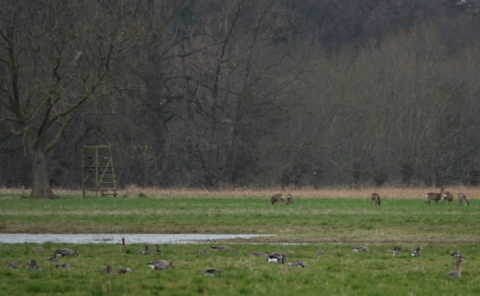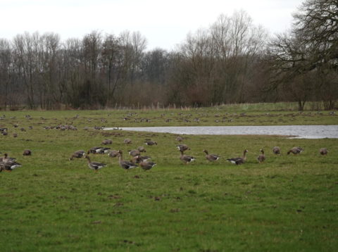 Neben Silberreihern, großen Trupps Blässgänsen, dazwischen Kanadagänse und Graugänse sowie Futter suchende Weiß-Störche konnte man auch wunderbar von der Wiesenstraße aus Feld-Lerchen beobachten sowie einige Große Brachvögel erleben.