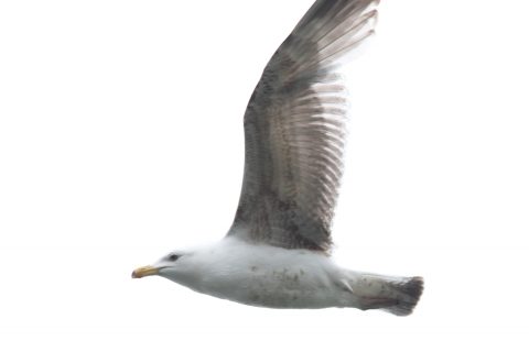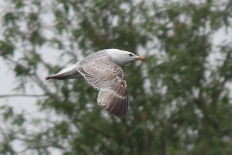 Genauso schwer war dann die Bestimmung einer vermutlichen K3 Mittelmeermöwe. Erst als Silbermöwe angesehen, deuteten der weiße Kopf und die Farbe der Flügel doch eher auf Mittelmeer oder Steppenmöwe hin. Das Auge wirkte im ersten Moment dunkel, was für Steppe spricht, aber der Schnabel ist wohl zu dick. Bei genauem Hinsehen wirkt die Iris dann doch auch hell. Also wohl eine K3 Mittelmeermöwe.