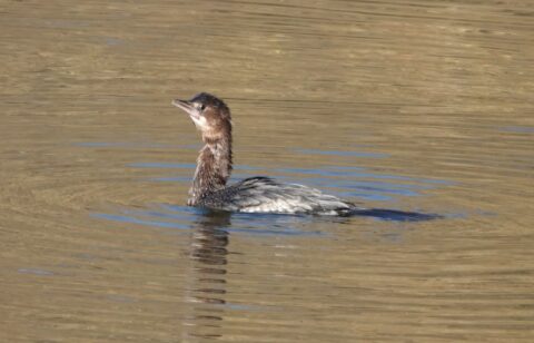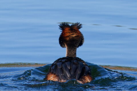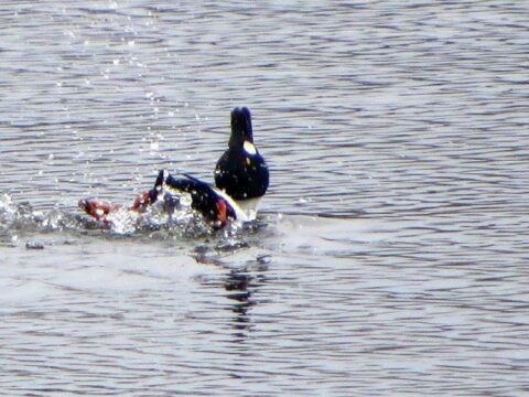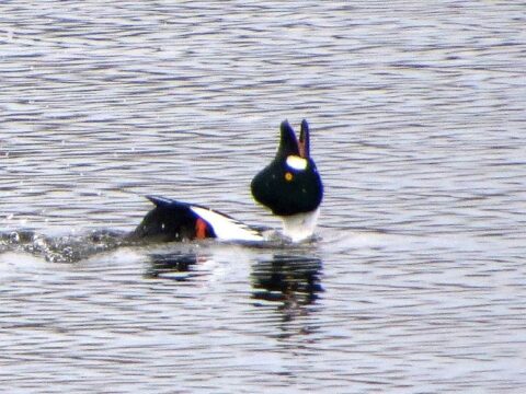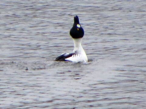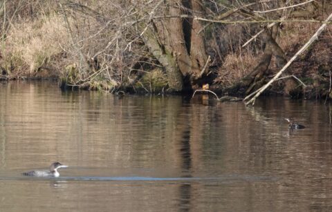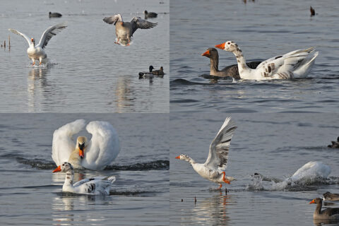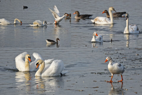 Über 15 Minuten lang wurde dieses Individuum von einem adulten Paar Höckerschwäne hin- und her gescheucht. Zum Schluss interessierten sich noch die jungen aus dem letzten Jahr für diese spezielle Graugans und schwammen ihr eine Zeitlang hinterher.