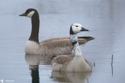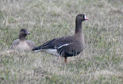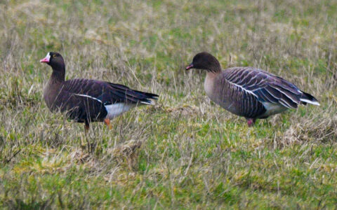 Am Wiesenteich westlich des Landerbachs konnte ich heute zwei besondere Gänse entdecken: Eine Kurzschnabelgas in Gesellschaft einer weiteren Gans, bei der einiges für eine Zwerggans spricht. Evtl. Hybrid mit Blässgans? Eine Beringung war wohl wg. des hohen Grases nicht zu erkennen. – R. Kleinehagenbrock danke ich für seine Bestimmungshilfe.