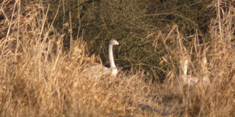 Heute Morgen ließ sich der Singschwan einmal kurz zwischen dem dichten Bewuchs an der Ostseite des Enger Bruchs blicken, bevor er gegen 10:10 Uhr Richtung Westen abflog – allein und ohne die drei Höckerschwäne, mit denen er zuvor zusammen gewesen war.