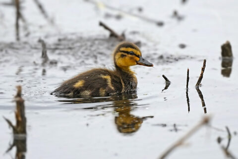 Im Enger Bruch sieht es mit Nachwuchs auch schon ganz gut aus. Eines der 12 Stockentenküken (Bild 02) schwamm nah am Weg auf dem ersten Teich.