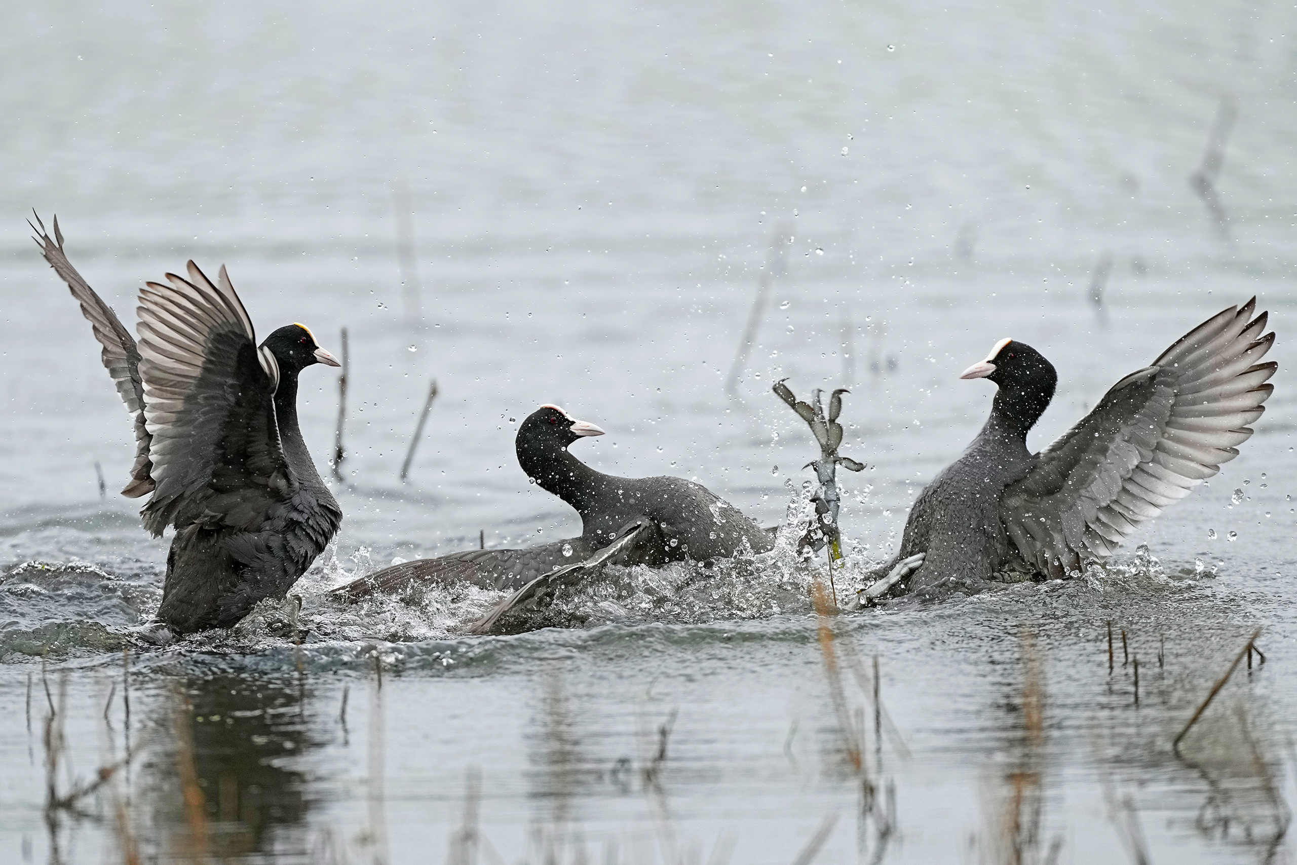 Die Revierstreitigkeiten der Blässhühner (Bild 03) arteten mal wieder in eine Wasserschlacht aus!