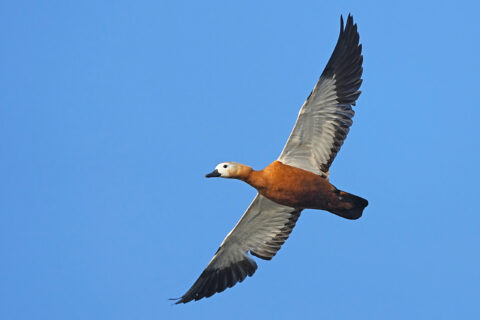 Die Rostgans (Bild 04) landete auf der Kranichwiese und äugte immer wieder in den Himmel, wohl auf der Suche nach Artgenossen. Nach einigen Rufen und einer kurzen „Putzstunde“, hob sie ab, drehte 2 Runden über der Kranichwiese und zog dann ab.