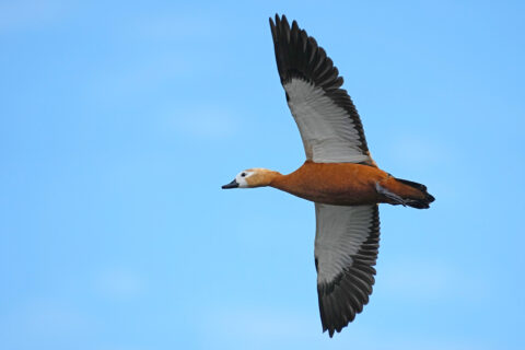 Die Rostgans (Bild 04) landete auf der Kranichwiese und äugte immer wieder in den Himmel, wohl auf der Suche nach Artgenossen. Nach einigen Rufen und einer kurzen „Putzstunde“, hob sie ab, drehte 2 Runden über der Kranichwiese und zog dann ab.