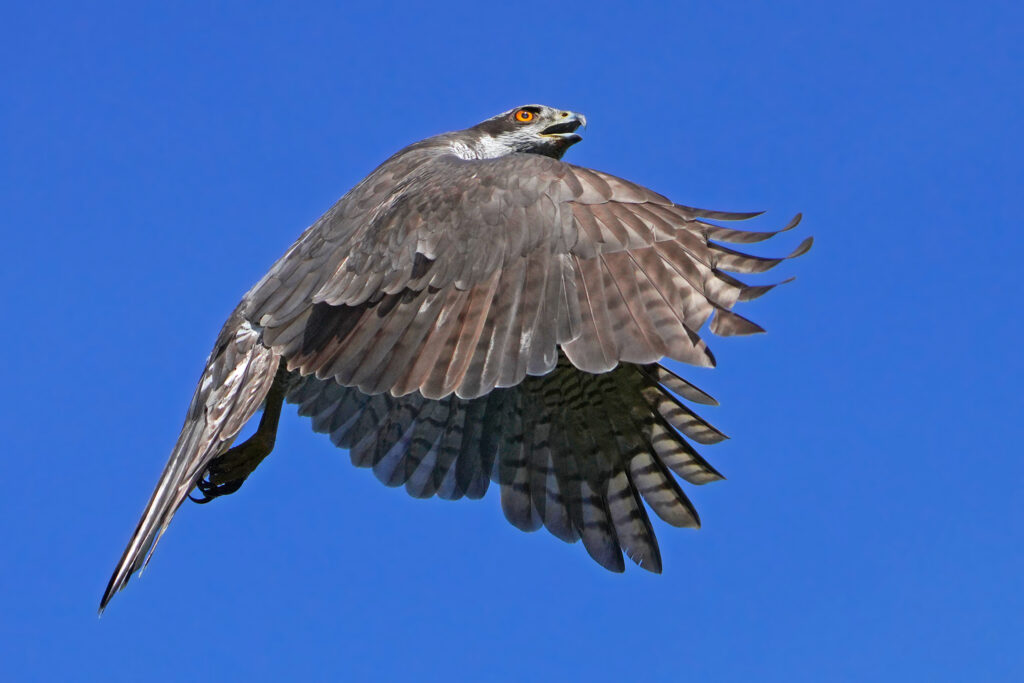 Als ich die Hände wieder frei und die Kamera eingeschaltet hatte, kam der Habicht wieder, vor ihm flüchtete ein Buntspecht auf den er es abgesehen hatte.
