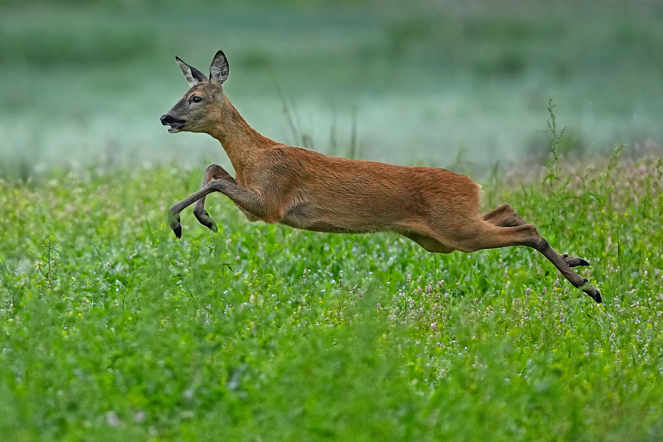 Ein weibliches Reh, aufgescheucht durch einen ordentlich angeleinten Hund, flitzte über die Kranichwiese. Teilweise sogar im Flug! 😉