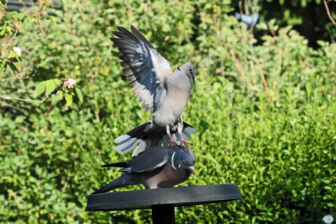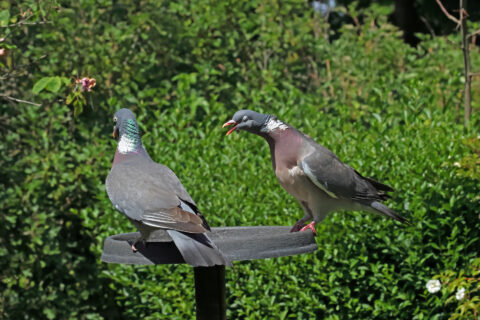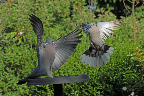 Wenn Tauben die Futterschale im Garten anfliegen, nehmen alle Singvögel Reißaus. Erstaunlich, dass die kleineren Türkentauben oftmals auch die deutlich an Größe überlegenen Ringeltauben attackieren. Aber die Ringeltauben sind sich auch untereinander oftmals nicht ganz grün.