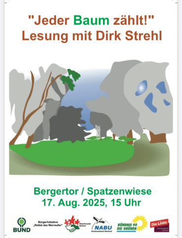 wir möchten euch gern zur Lesung „Jeder Baum zählt“ am kommenden Sonntag um 15.00 Uhr am Bergertorwehr einladen.