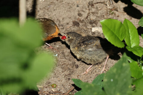 Nachdem die erste Brut in unserem Garten am 24.05.2025 erfolgreich beendet werden konnte (alle Jungvögel ausgeflogen), tauchte in der letzten Wochen ein Jungvogel der zweiten Brut bei uns auf. Dieser hatte das Nest in einem Alter von etwa 3 Wochen verlassen und hüpfte im Garten völlig ohne Scheu umher. Die Eltern waren entspannt, warnten nicht und der Kleine wurde vor meinen Augen gefüttert. Regenwürmer, Grashüpfer und Johannisbeeren konnte ich als Futter ermitteln. Bleibt nur die Hoffnung, dass die nachts durch den Garten streunenden Katzen den Jungvogel nicht entdecken,