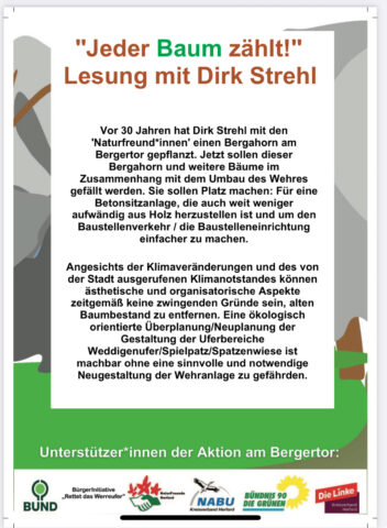 wir möchten euch gern zur Lesung „Jeder Baum zählt“ am kommenden Sonntag um 15.00 Uhr am Bergertorwehr einladen.