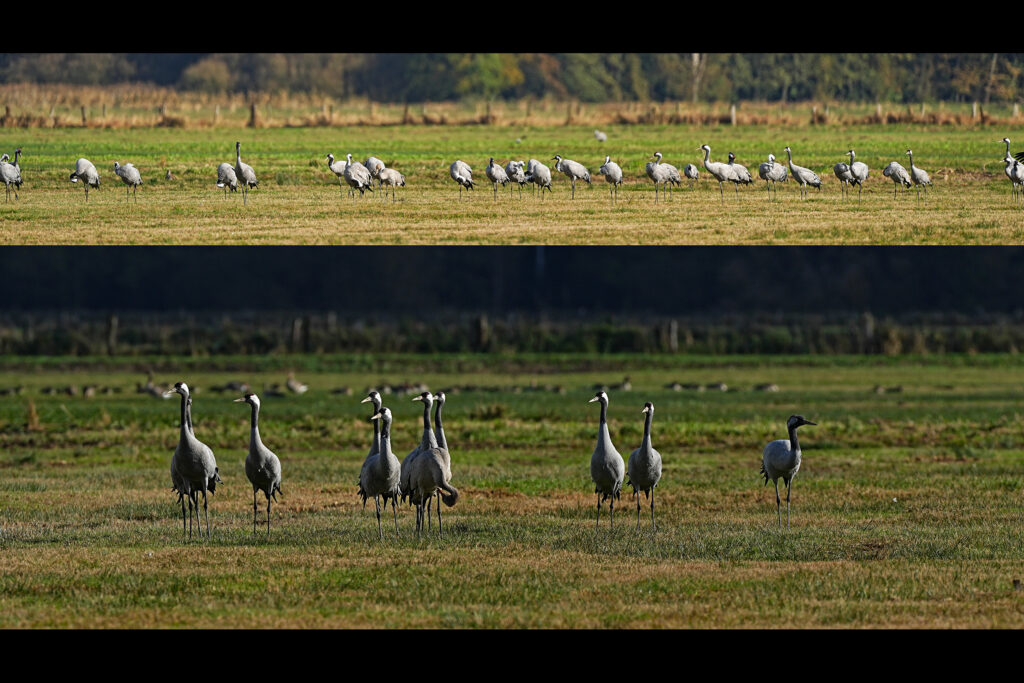 Ganz Interessant, in den Teichwiesen (Polder I) standen 91 Kraniche und ruhten sich aus. Immer wieder flogen auch Gruppen über, also intensiver Kranichzug heute.