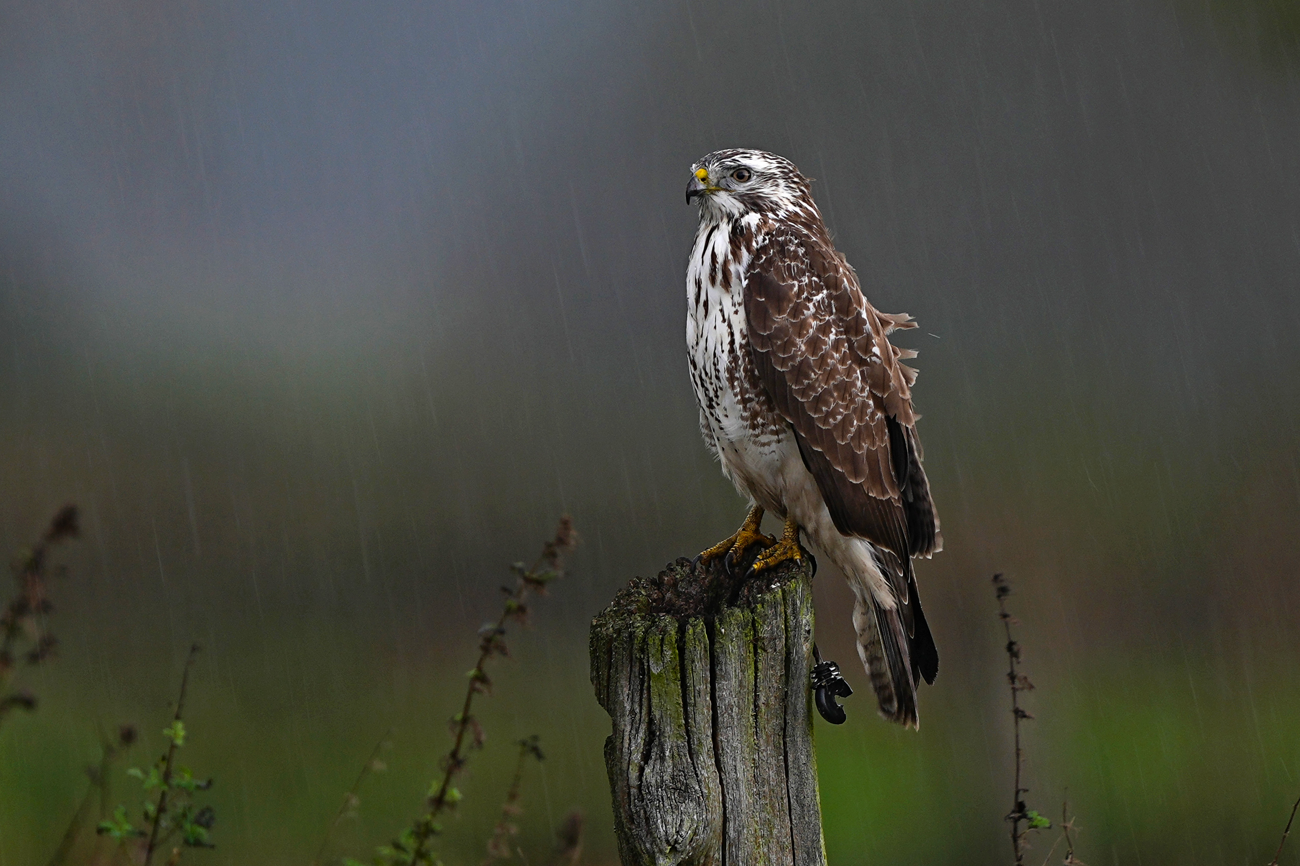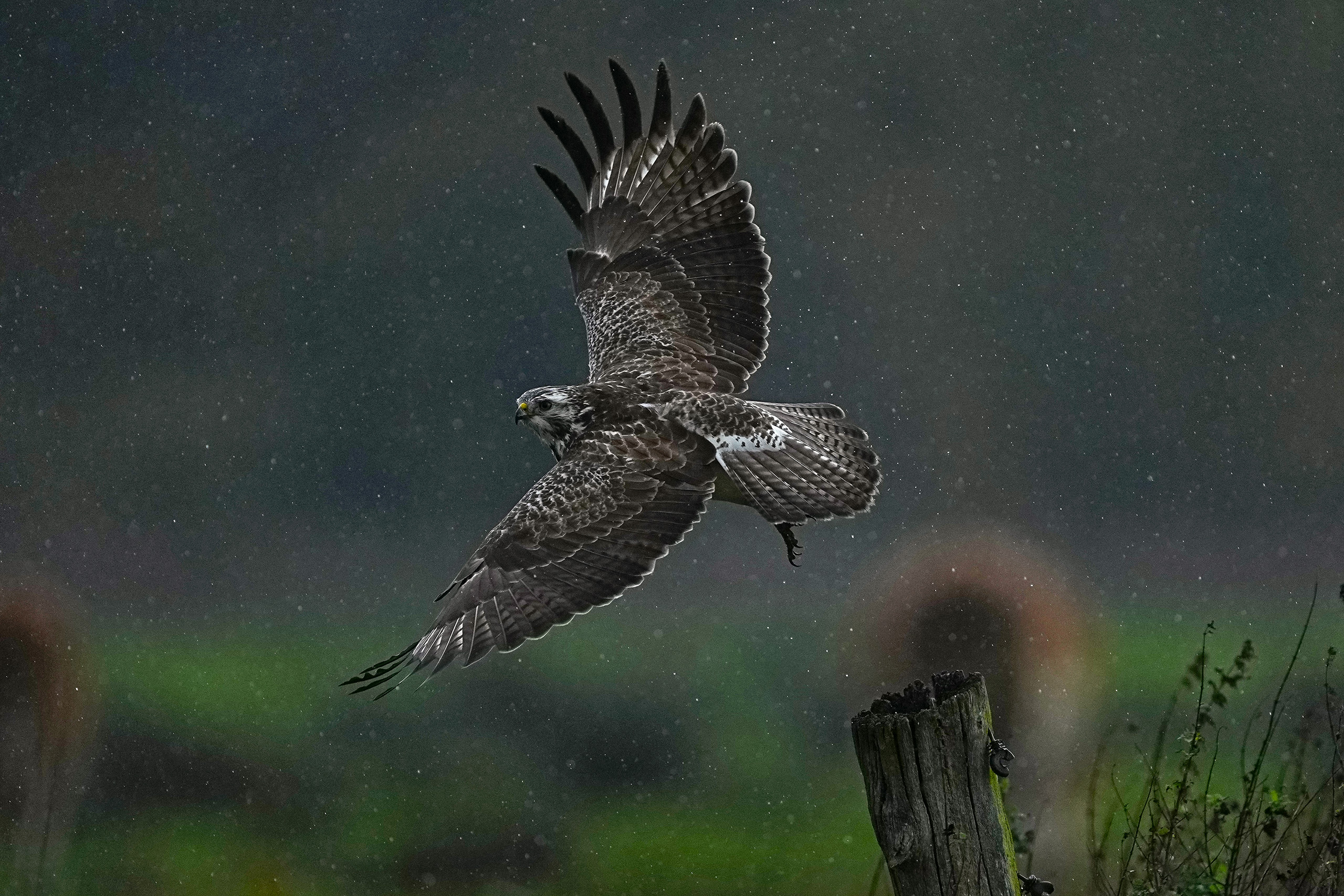 Später wurde auch hier das Wetter etwas schlechter und ein Mäusebussard saß ~15 Minuten lang im strömenden Regen. Ich habe solange gewartet bis der Regen weniger wurde und dann den abfliegenden Bussard fotografiert, inkl. „tausend“ Wassertropfen aus seinem Gefieder.