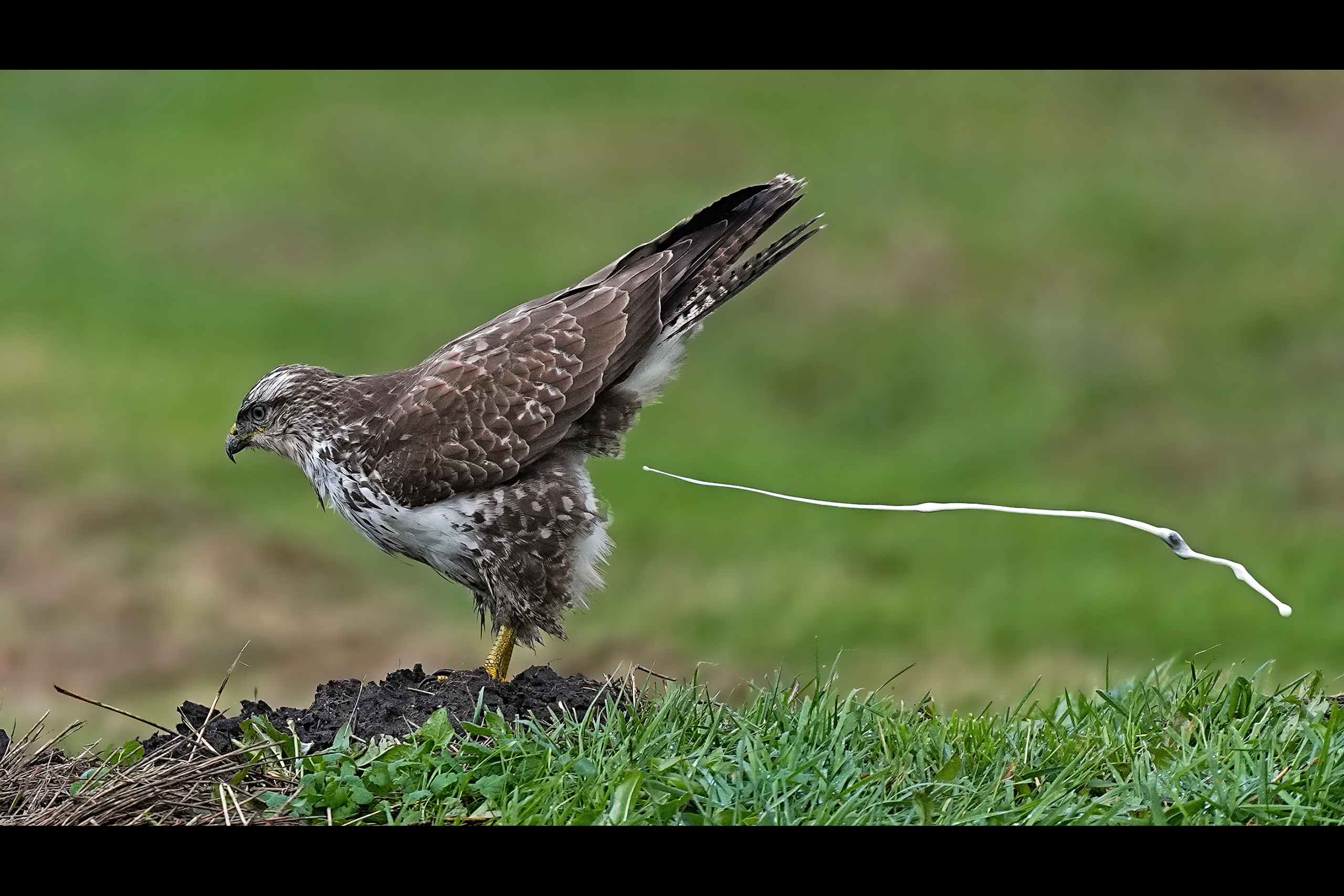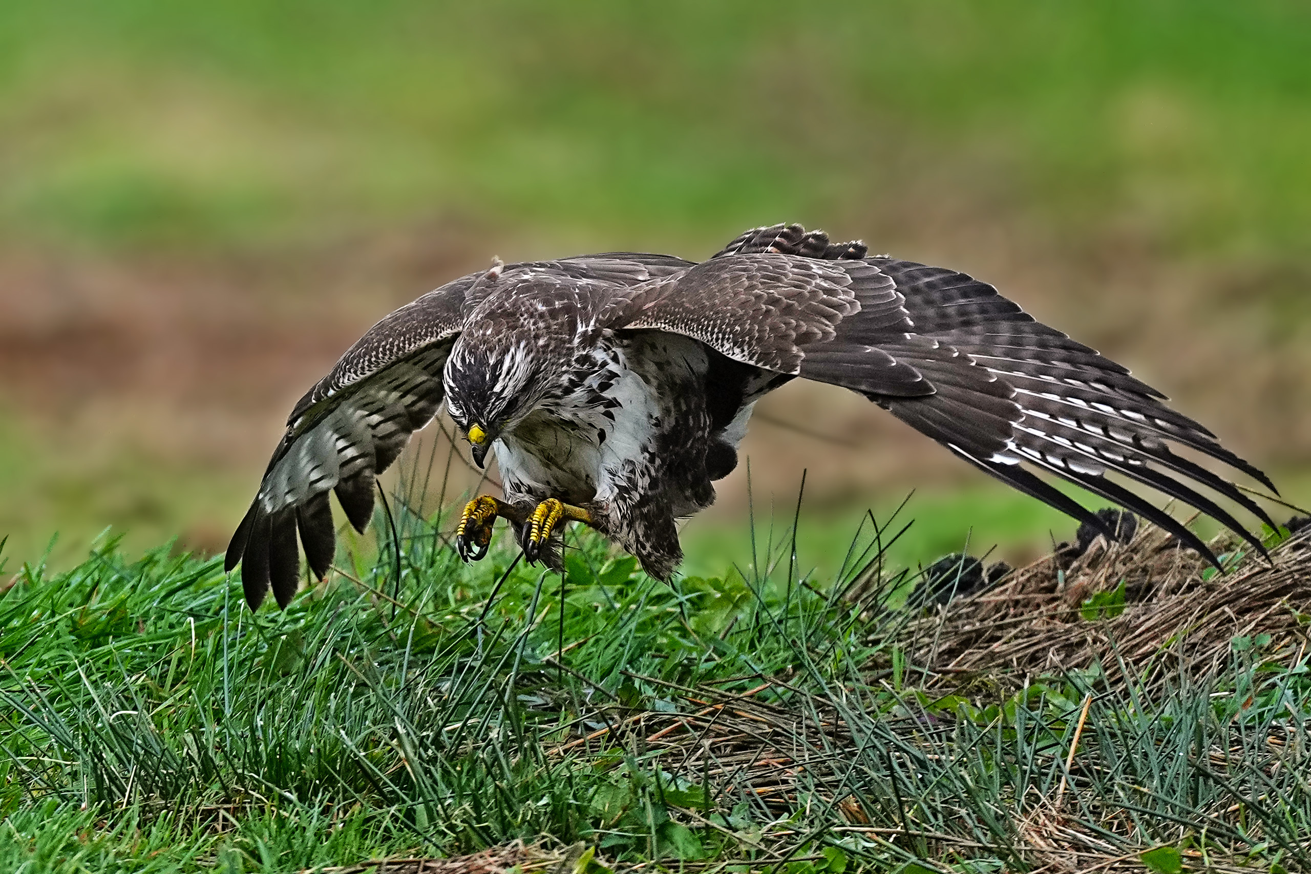Ein anderer Mäusebussard erspähte etwas im Gras und flog einen Angriff. Leider ohne Erfolg.