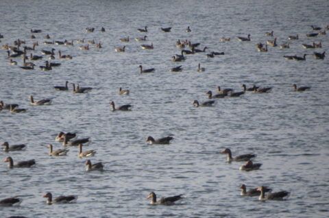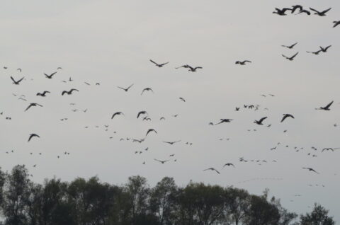 mehrere große Trupps von Gänsen (Blässgänse, Graugänse),