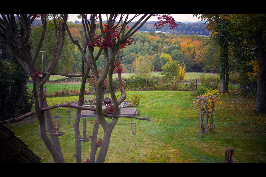 Ein Bestand an unterschiedlichen hohen Bäumen (2 Kiefern, Kastanie, Kirschen, Haselnuss und weitere), einige Büsche, viel freie Fläche und ein Teich, quasi Parkähnlich, lockt die unterschiedlichsten Arten an.