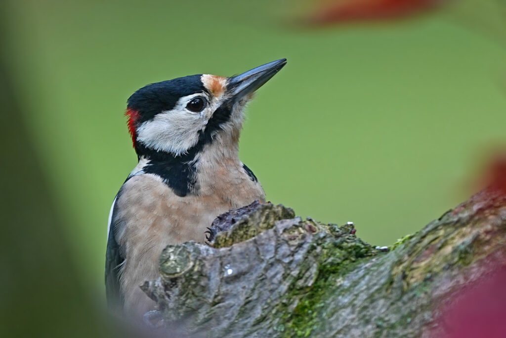 So z.B. „Flecki“. Ein Buntspecht mit einer untypischen Färbung auf der Stirn. Er, wie auch mindestens 7 weitere Buntspechte kommen an die Futterstellen und sind besonders auf die Meisenknödel fixiert.