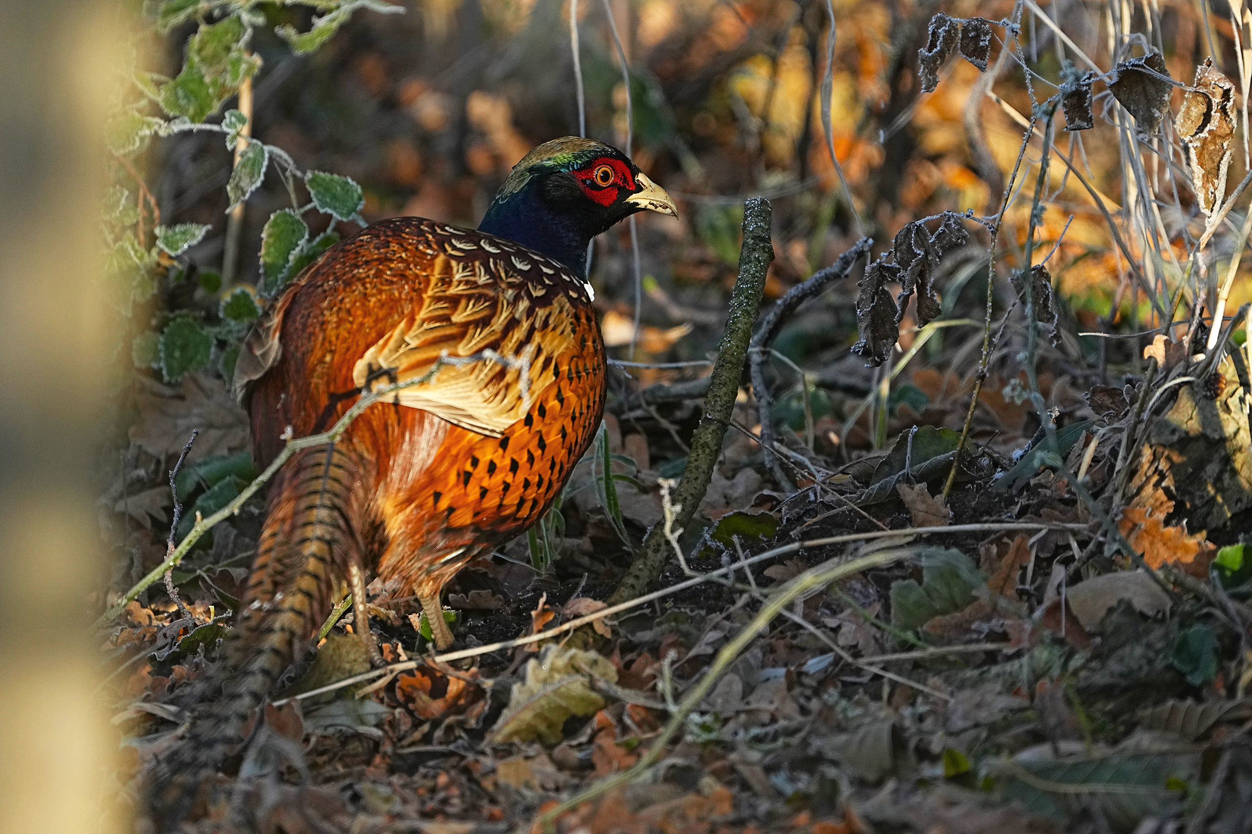 Ziemlich schnell konnte sich aber die Sonne durchsetzen und die Temperaturen stiegen von -6° auf „angenehme“ 0°. Da wurden auch die unzählbaren Fasane aktiv, die rund um den Dümmer beobachtet werden konnten, hier kurz vorm Südturm.