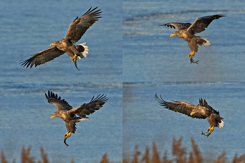 Er landete hinter einem Schilfgürtel und verspeiste den erbeuteten Fisch, als wir schnell einen zweiten Seeadler an gleicher Stelle entdeckten.