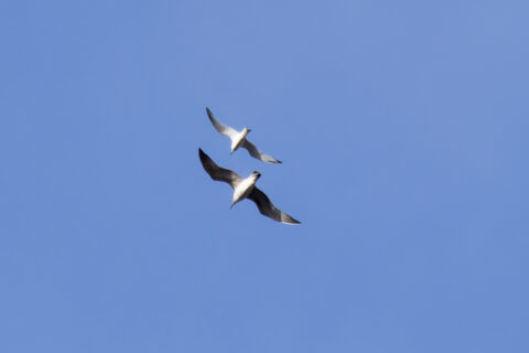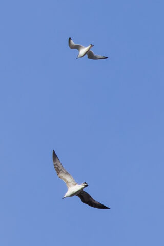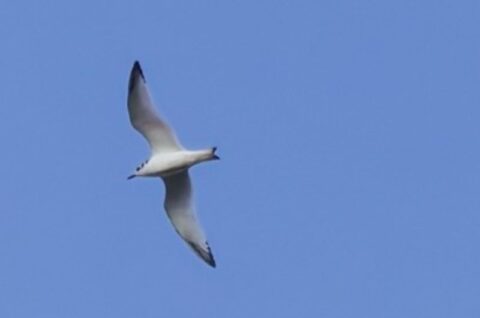 Als ich die im Spektiv anguckte als sie sich hochschraubte, kamen immer mehr dazu. Ich glaube, es waren nachher 15 Möwen. Eine Möwe fiel mir sofort auf, denn sie war kleiner als die Silbermöwen, hatte eine schwarze Schwanzendbinde, die gekerbt aussah und ganz dunkle dünn gezeichnete Flügelspitzen, zuerst dachte ich an Schwalbenmöwe. Schnell versuchte ich die Möwen zu fotografieren, aber Möwen, die im Spektiv schon klein sind, findet der Autofokus nicht wirklich gut. Dennoch gelangen ein paar brauchbare Bilder auf denen dann mit der Flügelzeichnung, der Kopfzeichnung und dem gekerbten Stoß eine junge Dreizehenmöwe identifiziert werden konnte.