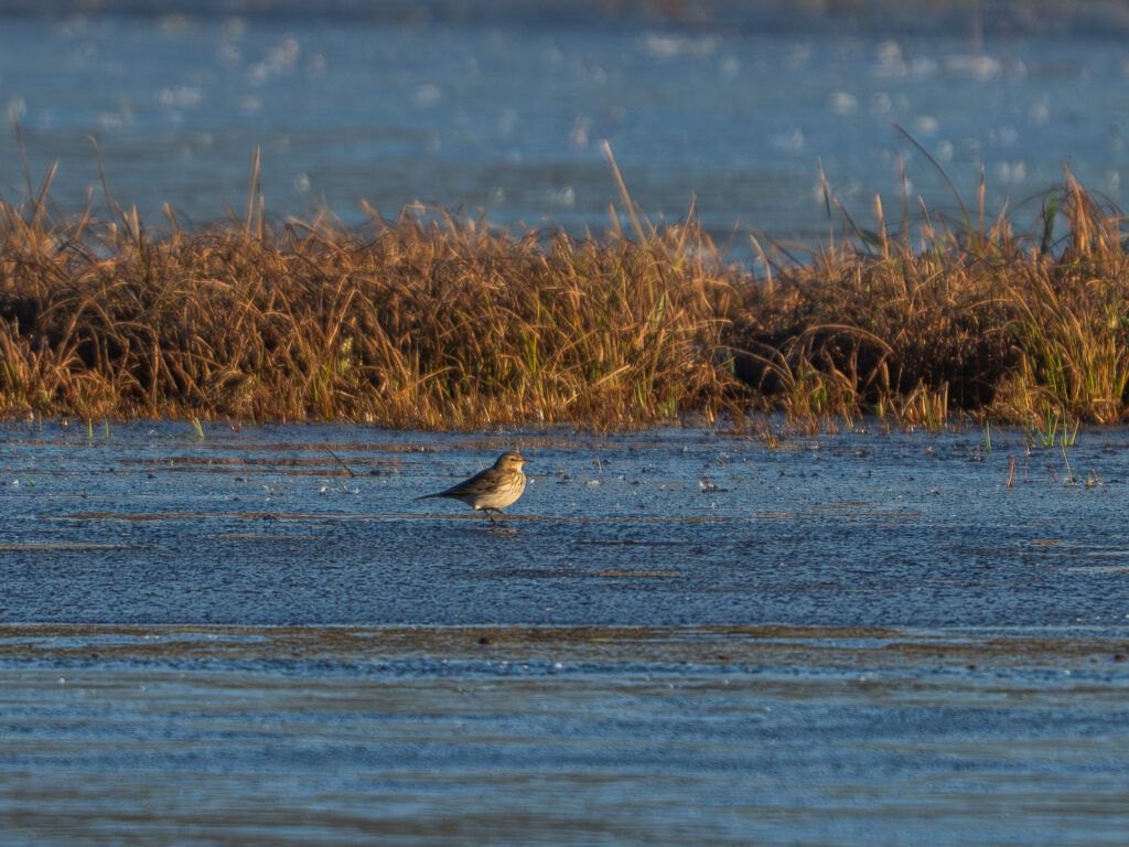 Mein Ziel waren heute eigentlich ein paar Pfeifenten und die Bergpieper die dort die letzten Tage gemeldet wurden. Pfeifenten konnte ich meiner Fotosammlung heute leider noch nicht hinzufügen. Dafür habe ich die Bergpieper auf der Kranichwiese gesehen. Leider auch weit weg. Für eine Belegaufnahme hat es aber wenigstens gereicht.