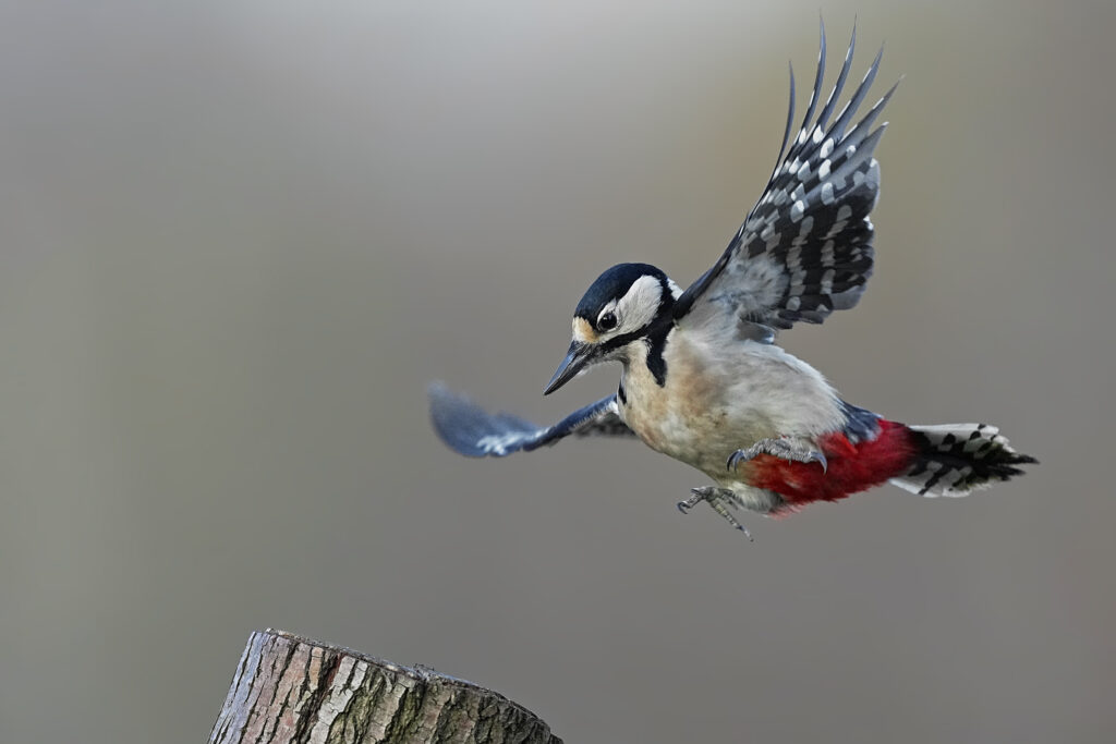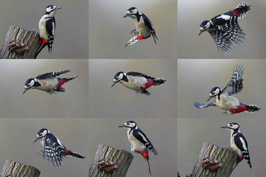 Vor irgend etwas hat sich das Buntspechtweibchen dann erschrocken und hüpfte Rückwärts in die Luft, breitete die Flügel aus und setzt zur Landung am gleichen Ort an.