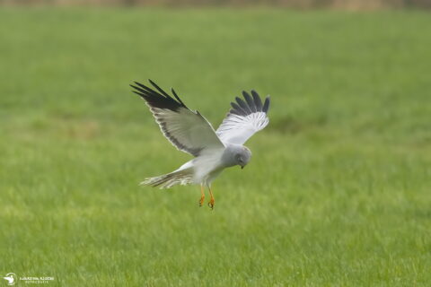Über einer Wiese war eine wunderschöne männliche Kornweihe