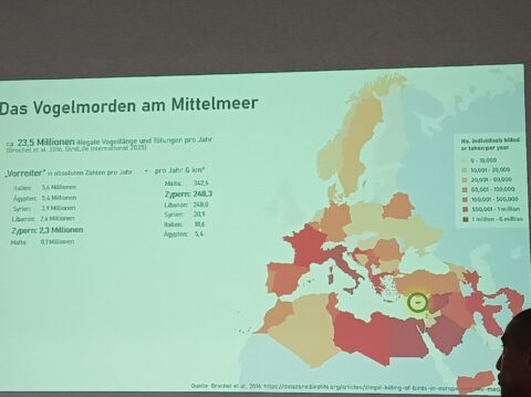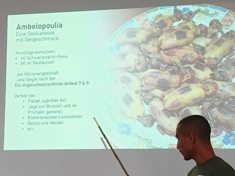 Tim Maximilian Rapps Vortrag: „Illegaler Vogelfang auf Zypern und wie wir ihn bekämpfen- die Arbeit des Komitees gegen Vogelmord e.V.“ zeigte den immer noch, insbesondere im Mittelmeerraum, sehr hohen Jagddruck auf Singvögel. Der Einsatz der Teams wurde beeindruckend dargestellt.