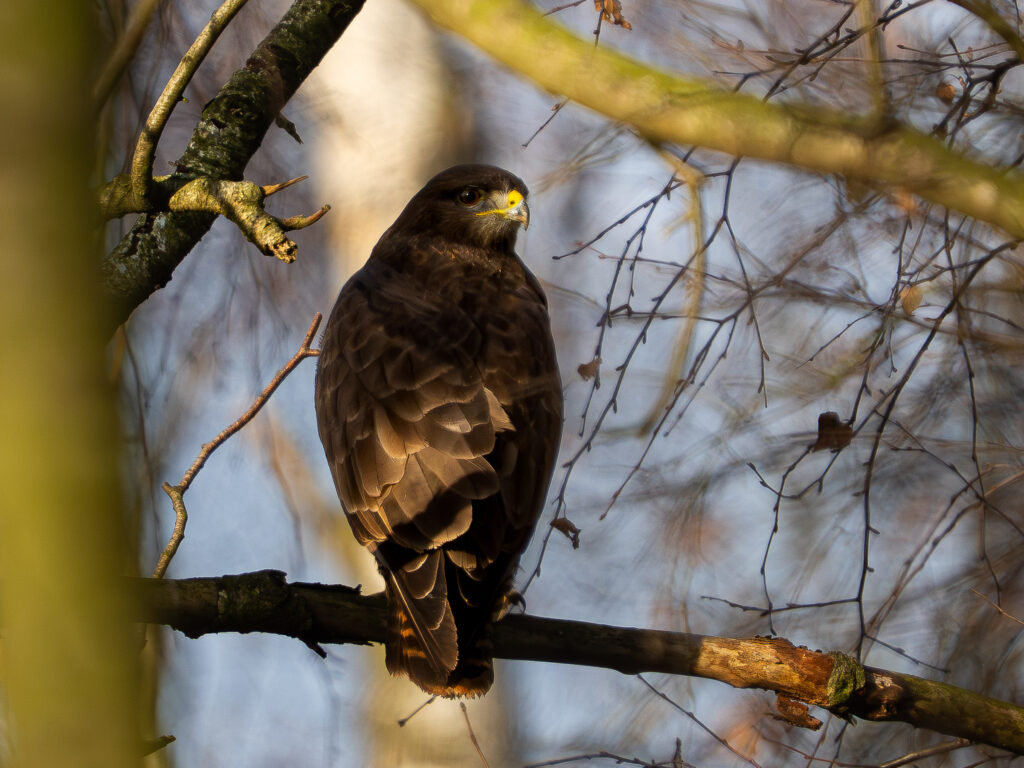 Kurze Zeit wurden die Eichelhäher extrem nervös und haben viel Alarm gemacht. Ein Greifer flog durch den Wald, doch ich konnte zuerst nicht erkennen um wen es sich handelt. Ich hatte erst an einen Habicht gedacht, da er für einen Sperber zu groß war. Ich konnte ihm aber gut folgen, da er sich immer in der Nähe des Weges aufgehalten hat. Am Ende hat sich dann herausgestellt, dass es dieser schöne dunkle Mäusebussard war.