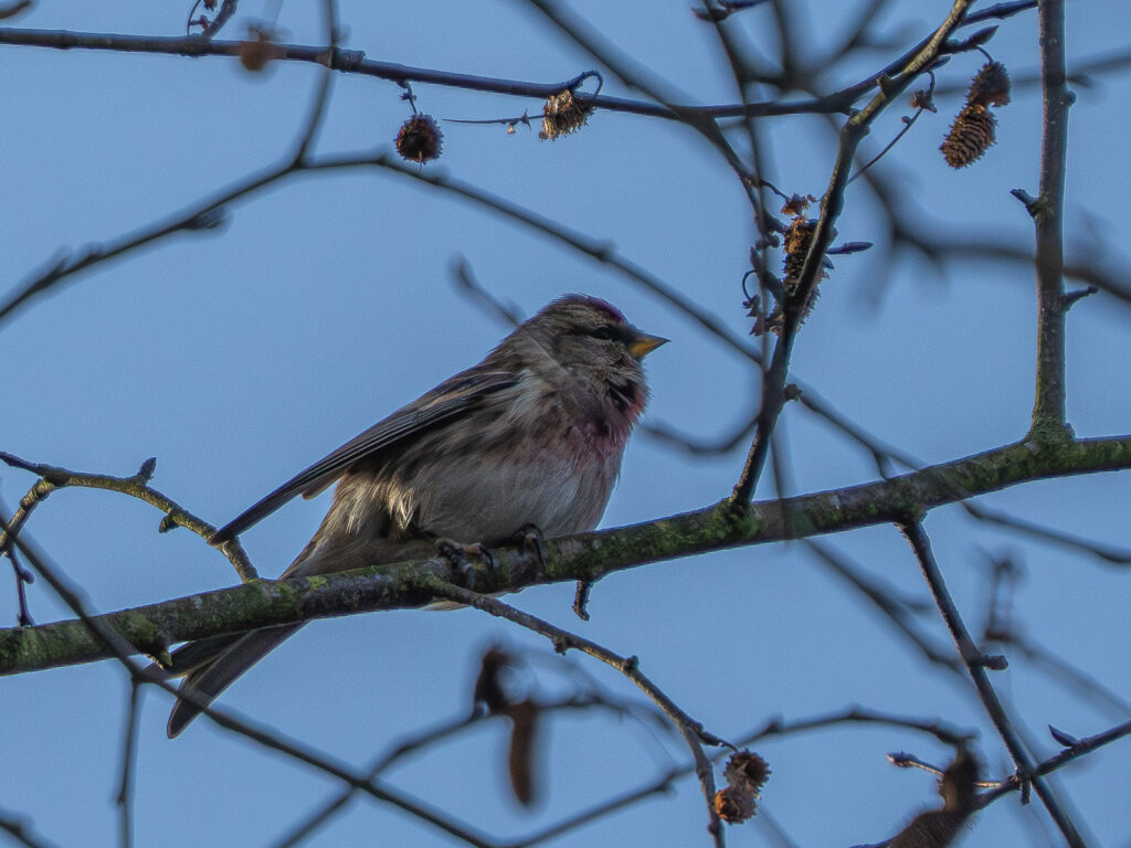 Von den beiden nächsten habe ich leider nicht so schöne Fotos. Die saßen leider ziemlich ungünstig im Gegenlicht. Aber als Belegaufnahmen sind die noch mehr als gut zu gebrauchen. Einmal der Birkenzeisig