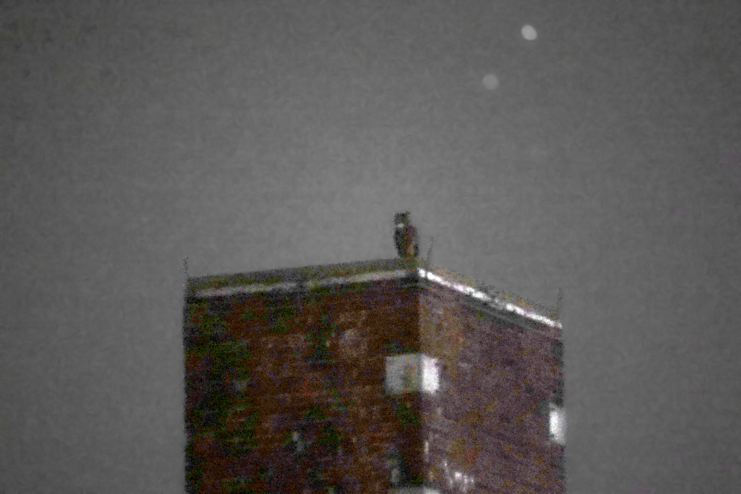 Auf einem Schornstein erkenne ich im Stockdunklen einen Umriss. Bingo, das ist der Uhu! Jetzt sind die Rufe überdeutlich zu hören.