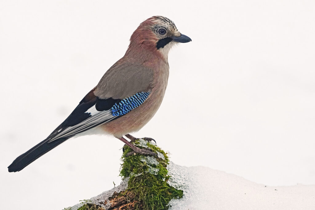 Einer der beiden Eichelhäher wird mutiger und traut sich immer näher an den Fototeich um nach Futterresten zu suchen. Gute Chance noch ein Winterbild zu machen, bevor die Tage sicher alles weggetaut ist.