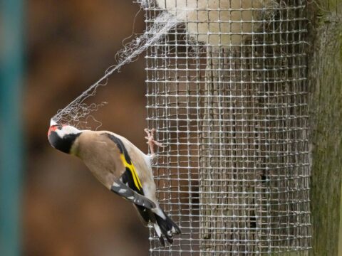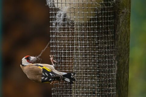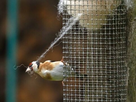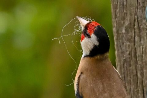 Ein weiblicher Stieglitz baut hier in Halle derzeit sein Nest. Den Standort selbst habe ich noch nicht herausgefunden. Üblicherweise hoch zwischen einer Astgabel (gerne in Roßkastanie). Das Weibchen zupft aus meinem Schafwollspender einzelne Fäden heraus und fliegt damit zum Neststandort, meist begleitet vom Männchen.