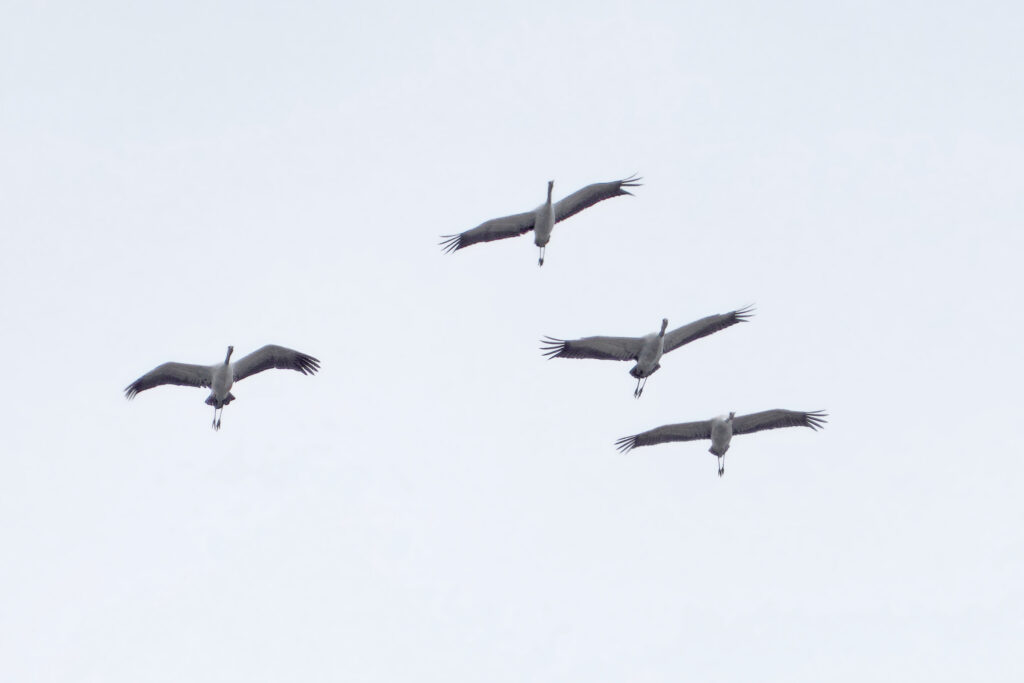 Besondere Rufe liessen einen zum Himmel aufblicken. 4 Kraniche kreisten kurz über dem Gebiet und flogen Richtung NO davon.