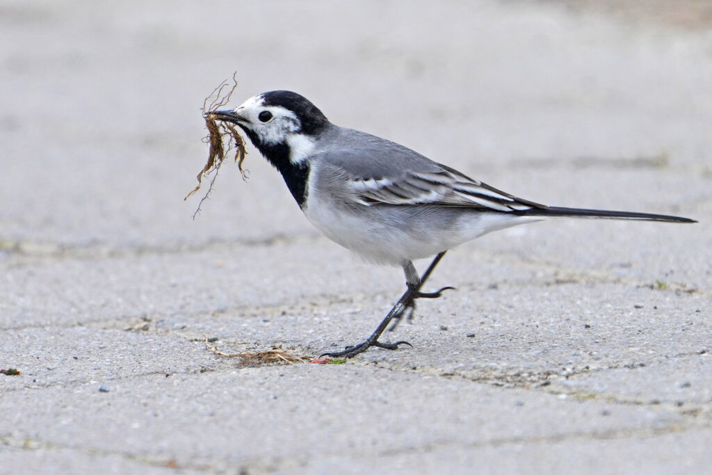 Auf dem Parkplatz sammelte eine Bachstelze Nistmaterial, auch bei dieser Art geht so langsam das Brutgeschäft los.