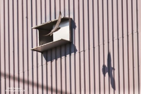 Das ist erfreulicher weise nicht der Fall. Das Wanderfalkenpaar hält sich noch im Nahbereich ihrer eigentlichen Niststätte auf und versucht auch sporadisch den Kasten an zu fliegen.