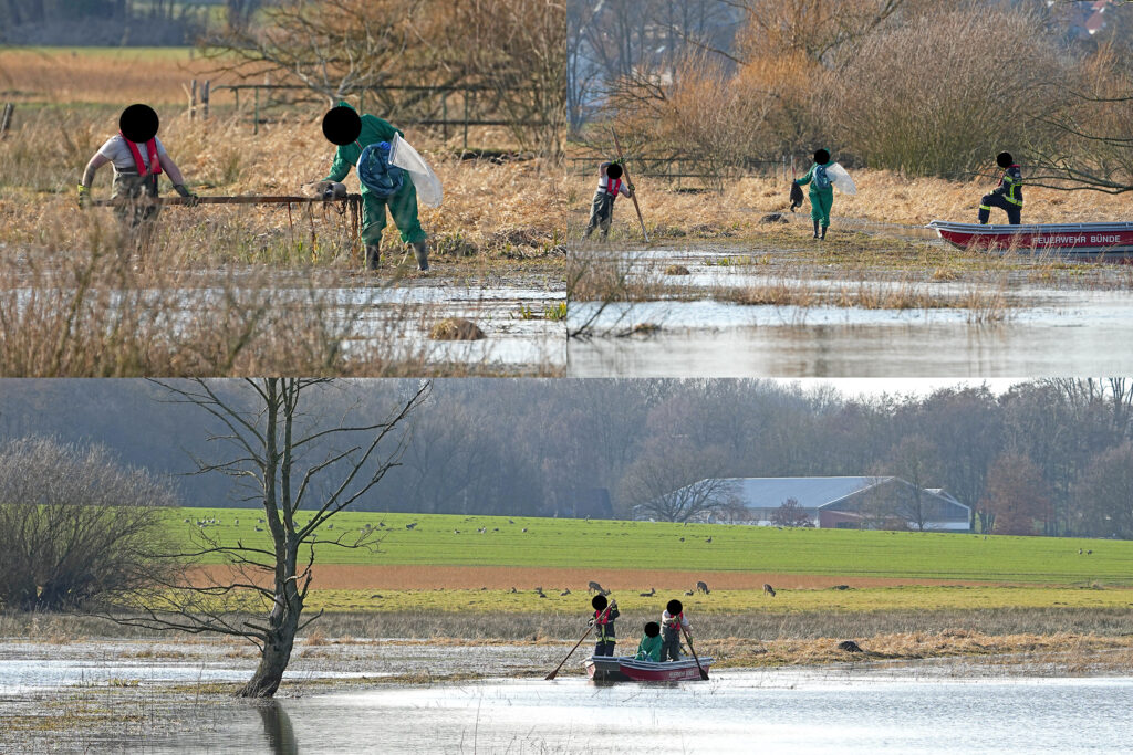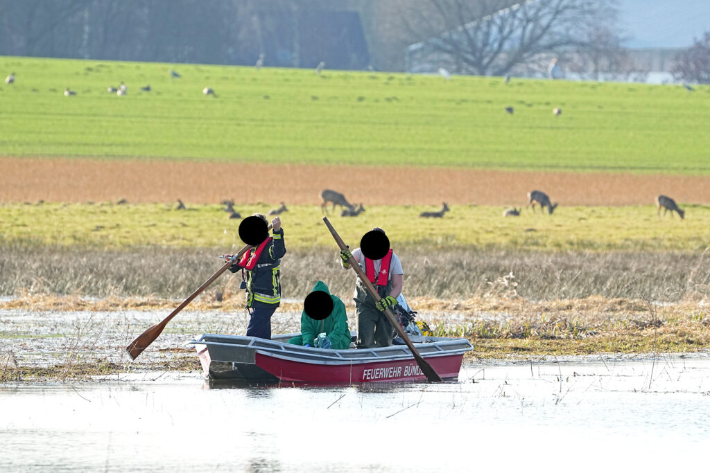 Also kontaktierte die Dame vom Amt die Feuerwehr in Enger. Als der Feuerwehrmann eintraf, stellte sich heraus, das Enger wohl kein geeignetes Boot hat. Somit kam die Feuerwehr Bünde ins Spiel und rückte mit einer ordentlichen Mannschaft und einem Boot an.
