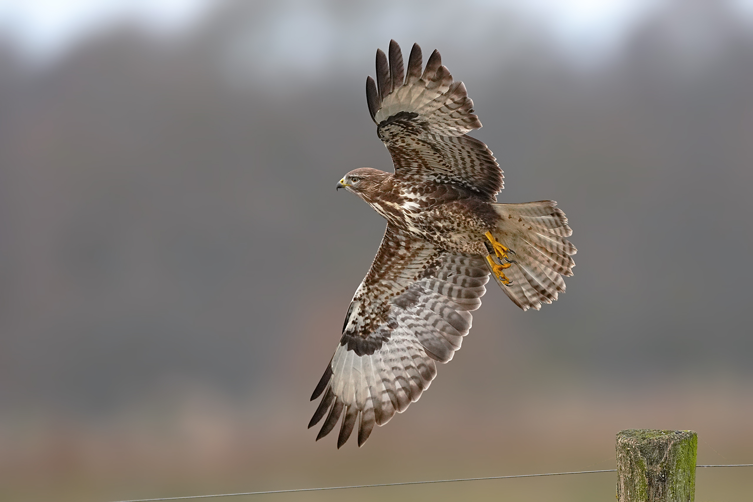 Etwas näher liess mich ein Mäusebussard kommen. Er blieb eine Weile auf dem Weidepfahl sitzen und gab mir Gelegenheit, ihn beim abfliegen zu erwischen.