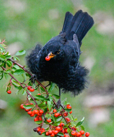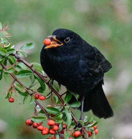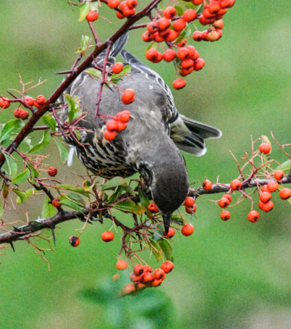 Die Früchte des Feuerdorns werden üblicherweise spätestens Mitte Oktober abgeerntet. Doch erst jetzt, Ende Dezember, wird diese Nahrungsquelle stärker frequentiert. Aktuell bedienen sich bis zu fünf Amseln und zwei Misteldrosseln an den Beeren. Inzwischen müssen die Vögel auf den dünneren Zweigen balancieren, wobei eine der Amseln kurzzeitig ihr Brustgefieder abspreizte – Balancierhilfe?